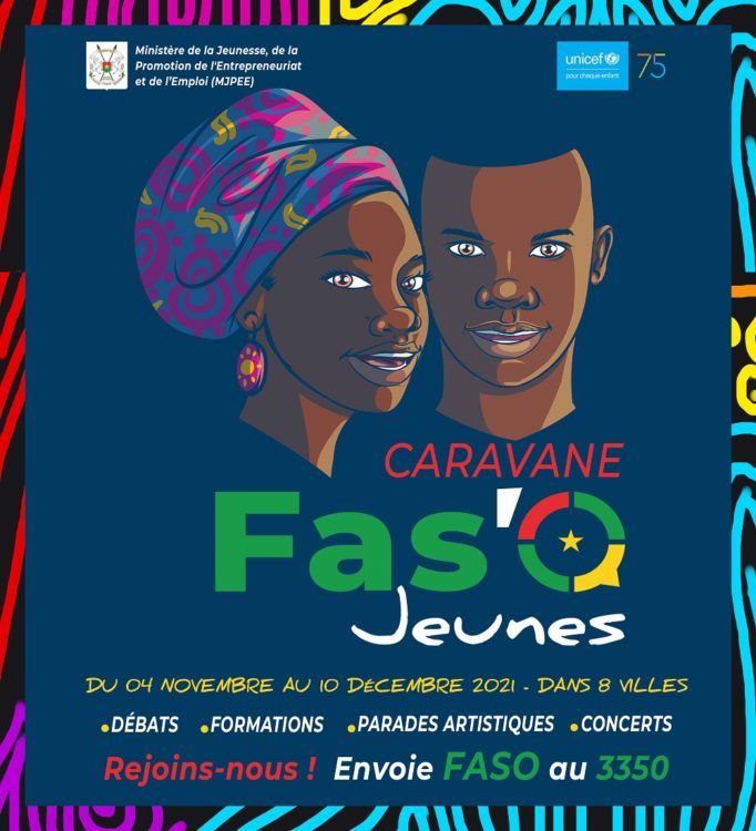 OUAGADOUGOU, 5 novembre 2021 – L’UNICEF lance aux côtés du Ministère de la Jeunesse et de la Promotion de l’Entreprenariat et de l’Emploi, la Caravane Faso Jeunes, dont l’objectif est d’accroitre les opportunités d’engagement et d’actions des jeunes et adolescents au Burkina Faso. Au programme de la caravane : formations, débats, sensibilisations, actions citoyennes, activités sportives, parades artistiques et concerts de nombreux artistes engagés en faveur des droits des enfants et des jeunes.
